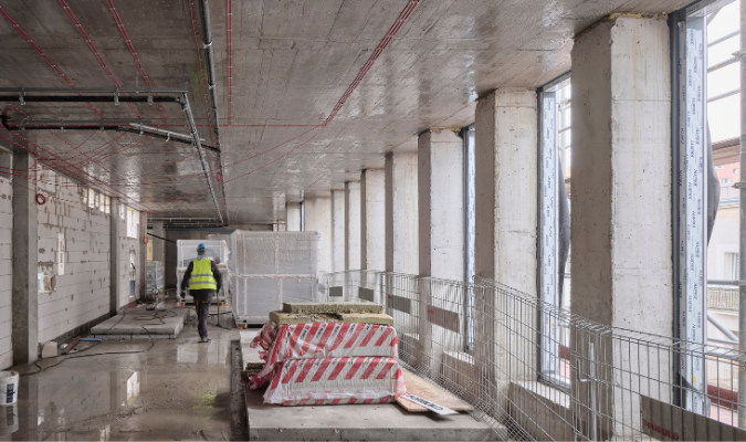 Pod koniec miesiąca pogoda się poprawiła, co pozwoliło wrócić także do robót na zewnątrz. Wznowiono montaż fasady budynku biurowo-administracyjnego. Pojawiające się kolejne elementy elewacji sprawiły, że cały kompleks zaczął wyraźnie zmieniać swój wygląd, przyciągając uwagę przechodniów i coraz lepiej wpisując się w zabytkową okolicę budynków dawnego szpitala. Również we wnętrzach widać już pierwsze efekty prac wykończeniowych. Powstają nowe posadzki lastrykowe inspirowane dawnymi wzorami.